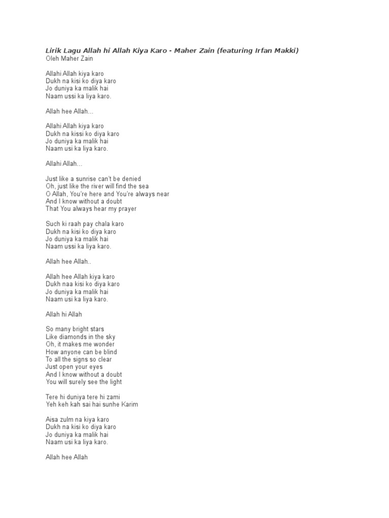 . Allahi Allah kiya karo Dukh na kisi ko diya karo Jo duniya ka malik hai Naam ussi ka liya karo. Yudha Kristiawan Editor. Lirik Lagu Allahi Allah Kiya Karo Maher Zain feat Irfan Makki Allahi Allah kiya karo Dukh na kisee ko.